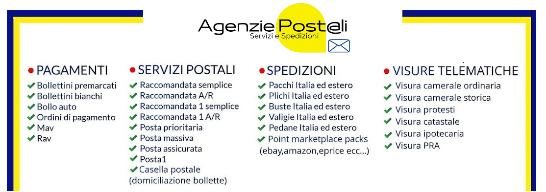 Sono davvero molteplici i SERVIZI che puoi offrire ai tuoi clienti. Da tutti i tipi di Bollettini alle Spedizioni nazionali e internazionali. Inoltre puoi rilasciare Visure e offrire tutti i Servizi Postali!